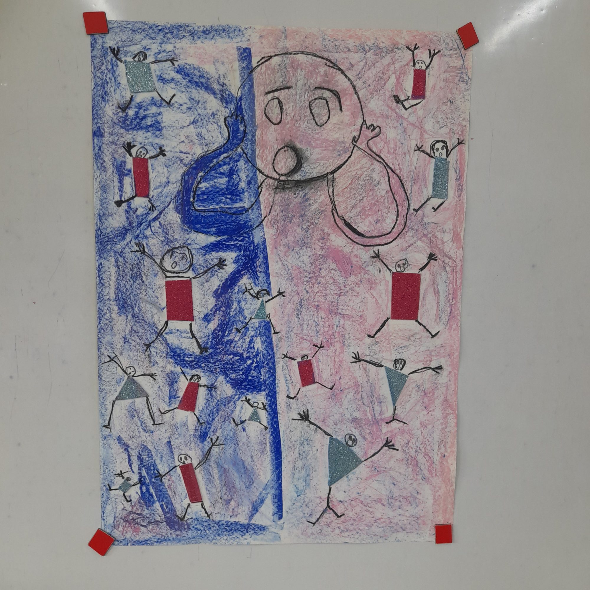 Los alumnos trabajaron en grupo, como primer paso , realizaron un dibujo inspirándose en el cuadro de Klee, cada una de estas emociones debía estar representa: la alegría , el asombro, el miedo, la ira , el disgusto y la tristeza.